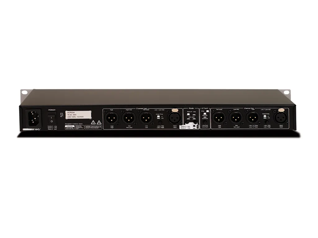 Signal ProcessorThe ACR 234 is an active crossover that can be used for 2-, 3- or 4-way separation. It features 25 Hz Butterworth 12 dB per octave low-cut, 34 dB per octave Linkwitz-Riley crossover filters, independent gain controls per channel, and optional mono addition of the low-frequency (subwoofer) output.